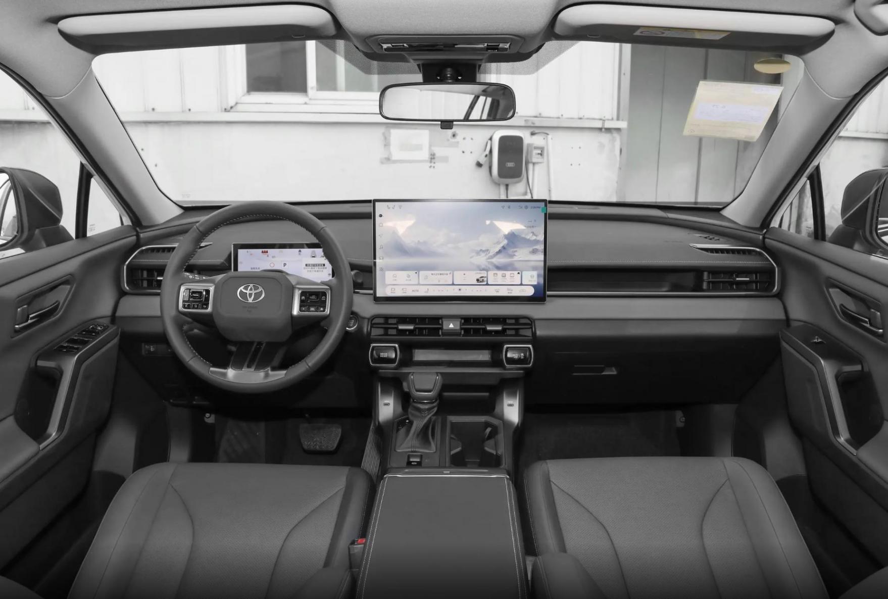 外观上,这车走的是硬派实用的风格,没有拍脑门的噱头,给人的第一印象就是扎实。它采用了所谓的“双脸设计”,不同驱动版本的外观有细微差别,能满足不同人群的偏好。四驱车型还标配Adventure越野套件,黑色双横幅前格栅搭配粗壮的镀铬饰条,中间的丰田LOGO在解锁时会渐进点亮,看上去既有野性又显得讲究。格栅两侧的C形LED大灯很有攻击性,三段式的光源布局,日间行车灯沿轮廓延展,与格栅呼应得很到位。不管白天还是夜晚,辨识度都挺高。前脸下方是大面积的黑色防刮材料,中间有银色护板,两侧还有方形雾灯和宽大的导风槽,这些设计不仅看起来更硬派,还实打实能保护底盘、给刹车降温,日常用车里省心的点就挺多。两驱版本就换成了蜂窝状格栅,镀铬饰条更细,风格偏向城市时尚,日常在市区穿梭,显得干净利落。