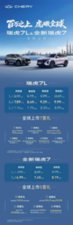 4月8日,奇瑞“瑞虎7双车&瑞虎5运动版在芜湖迎来全球上市,瑞虎7L、新款瑞虎7、瑞虎5运动版三车齐发,备受关注的瑞虎7L超值置换价7.19万元-8.99万元,全新瑞虎7限时优惠价6.99万元-8.19万元,瑞虎5运动版超值置换价6.79万元-7.79万元。