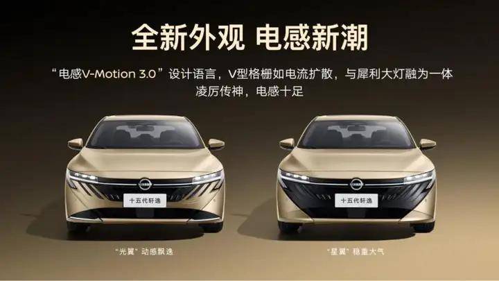 如果说印象中的轩逸是一副温顺内敛的“居家男”形象,那十五代轩逸的全新设计显然会颠覆你对这款新车的认识。电感V-Motion 3.0设计语言,“光翼”与“星翼”双前脸,投射式LED头灯以及溜背+鸭尾造型,都让十五代轩逸显得年轻动感且充满激情。这是一辆充满个性和辨识度的新世代轿车,更符合当下年轻用户的审美。