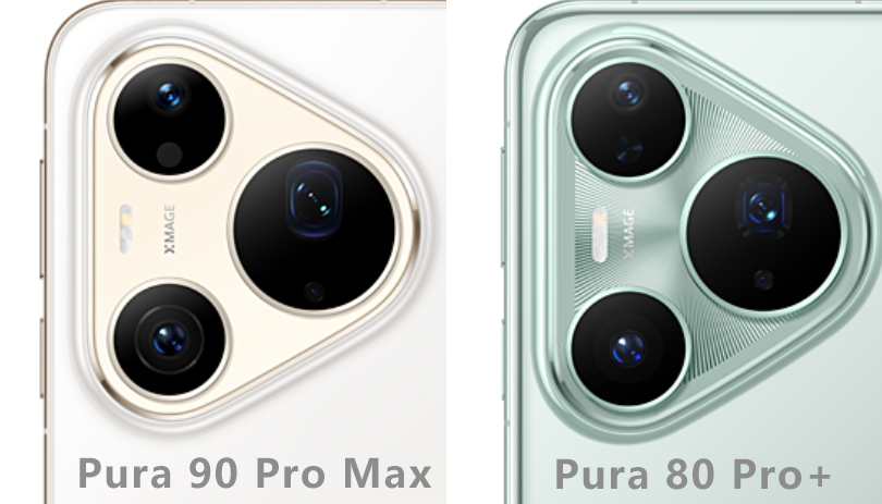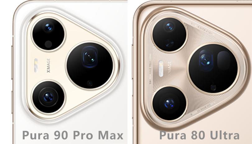 再来对比下Pura 90 Pro Max和Pura 80 Pro+的官方渲染图,两款手机的摄像头布局一致。