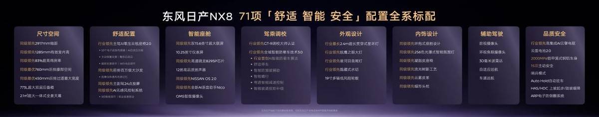 你肯定会说,很多新能源品牌都是这么做的。没错。但在合资阵营里,东风日产NX8是首个这么做的。说白了,东风日产的策略很简单:用合资品牌的制造体系、品控口碑作为底色,叠加新势力式的配置饱和攻击,打一个“品质+性价比”的组合牌。