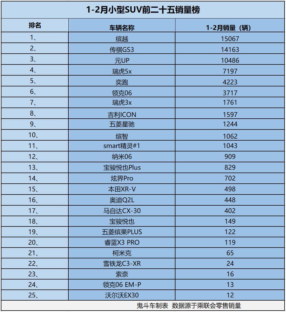 这一扎心数据的背后,是网友消费理念的转变与政策退坡等政策因素的影响。从1-2月小型SUV销量排名前二十五榜单上看到,数据源自乘联会零售销量数据,仅有三款小型SUV销量过万,接下来,看看具体车型排名与销量表现。