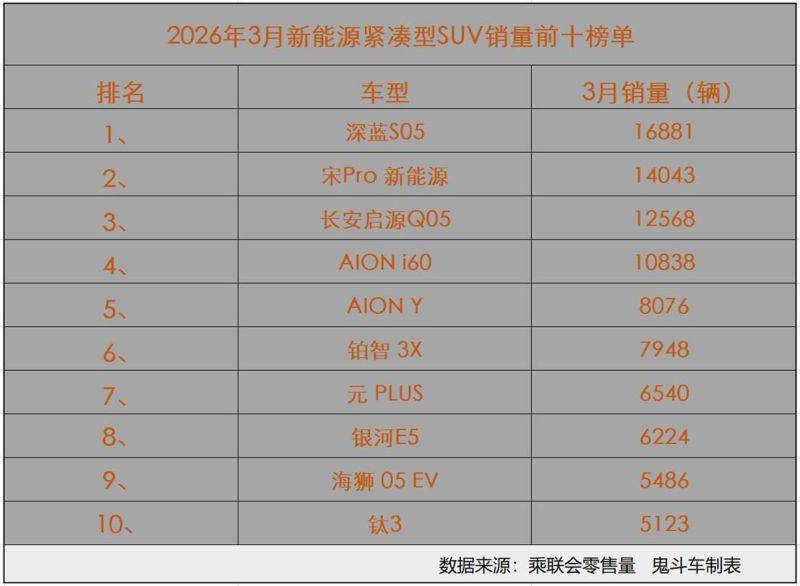 其实,很多人都没想到,3月,新能源紧凑型SUV市场的冠军车型会是深蓝S05,这款车型3月零售销量达到16881辆,成为榜单上的NO.1。实际上,深蓝S05在上市初期确实并未立即引爆市场,但随着2026款新增纯电车型上市,以及长安汽车持续优化产品力,深蓝S05的销量才迎来迅速攀升,成为市场“焦点车型”。