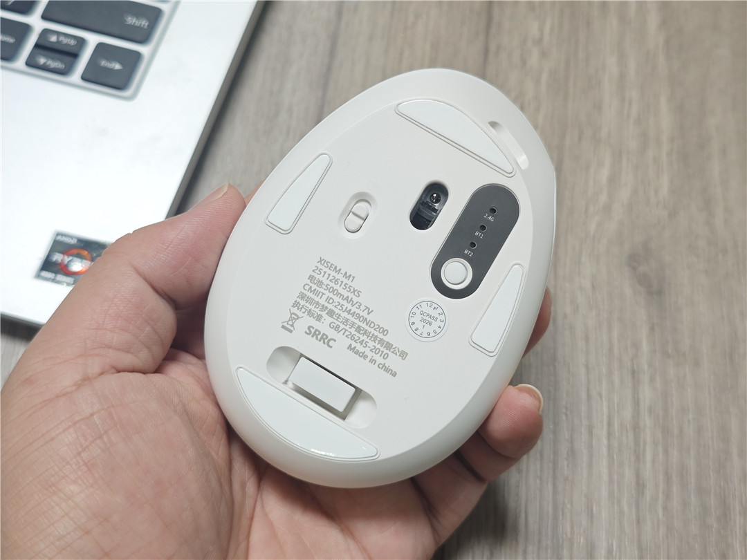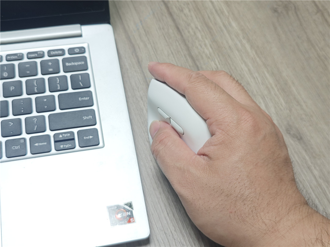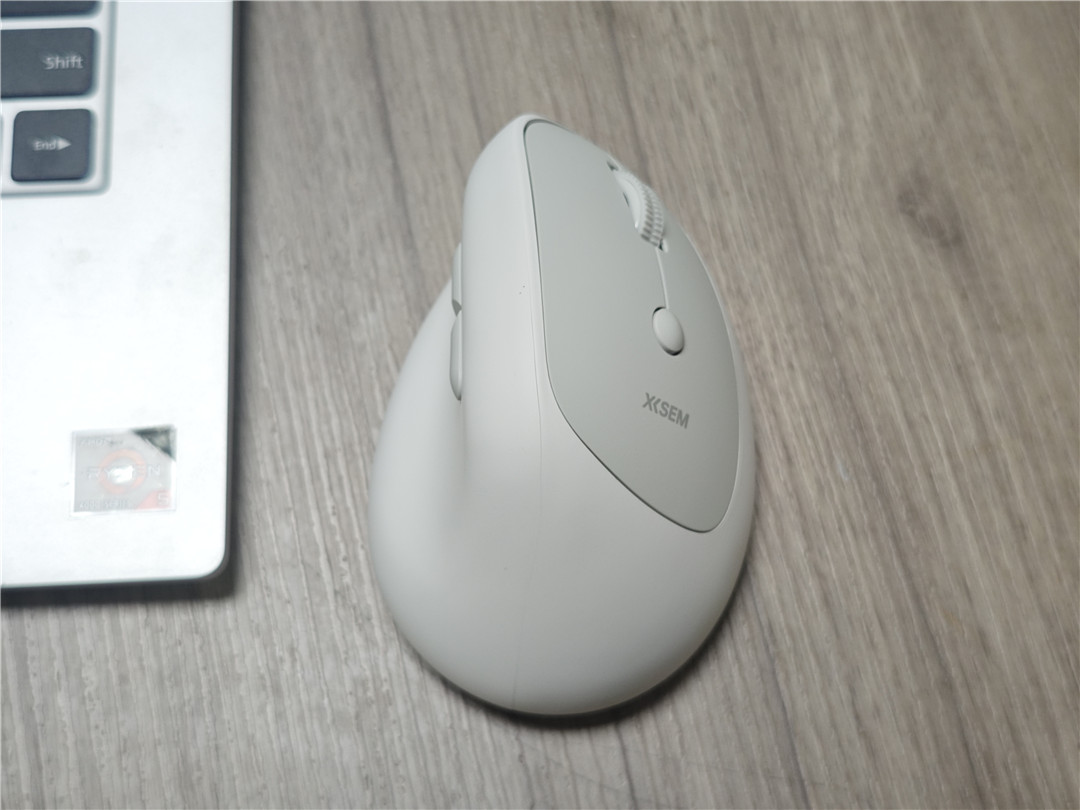 刚拿出西圣 M1,第一感觉就是它和普通鼠标完全不一样。不是那种夸张到难以适应的垂直造型,而是 56° 左右的倾斜角度,握在手里更接近自然握手的姿势,不会显得突兀。机身材质摸上去很亲肤,不滑不涩,夏天手心有点汗也不会黏手,整体做工很规整,没有毛边和松垮的缝隙,放在桌面上颜值简约耐看,不管是办公桌还是书桌都不违和。