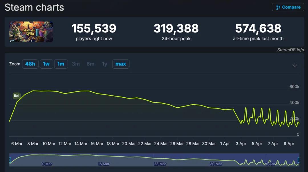 SteamDB数据显示,游戏历史峰值在线人数超57万,至今仍稳居Steam在线人数榜TOP 5。作为卡牌构筑品类的标杆系列,《杀戮尖塔》续作的市场表现,再一次印证了这一玩法的生命力。