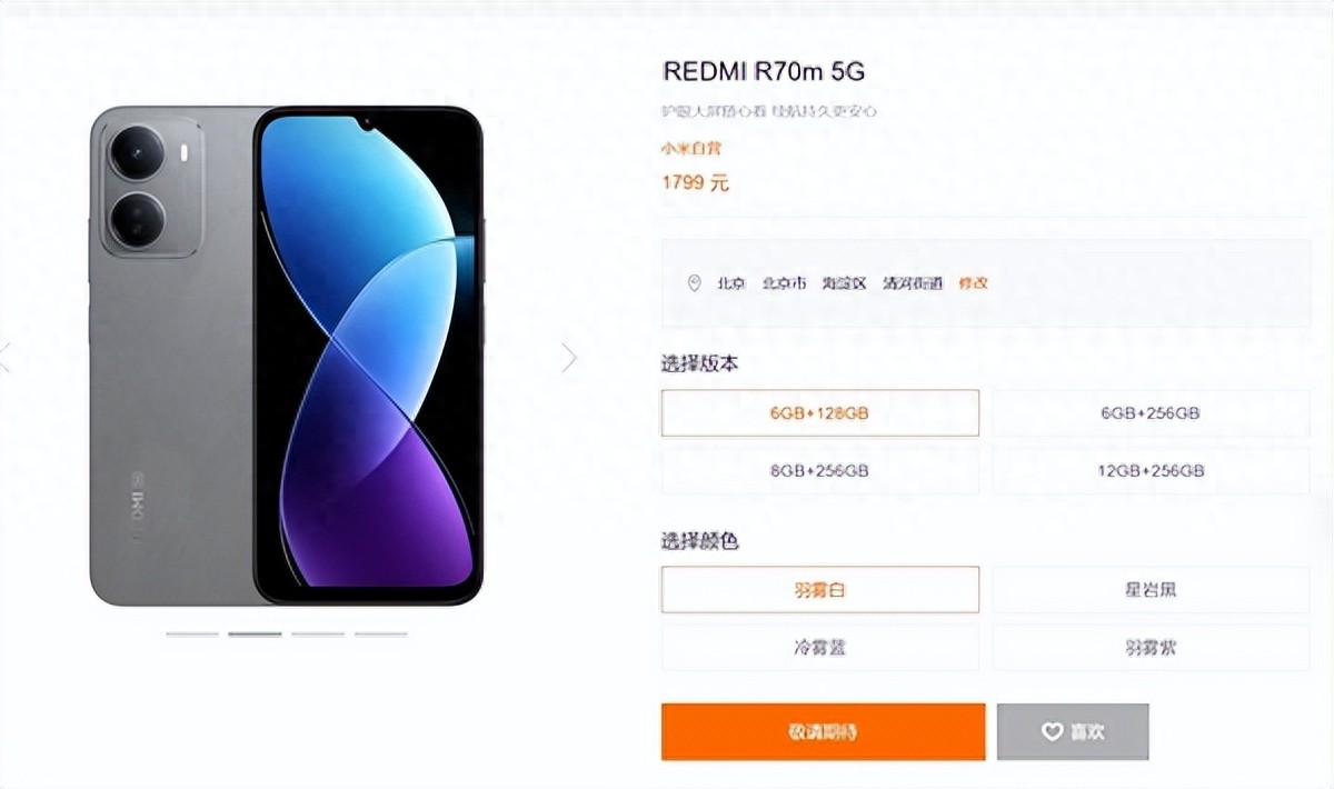 4月14日消息,小米商城最新上架了一款名为REDMI R70m的新机,起售价定在1799元。这款机型在配色上提供了丰富的选择,包括羽雾紫、冷雾蓝、星岩黑以及羽雾白四种时尚配色,满足不同消费者的审美需求。