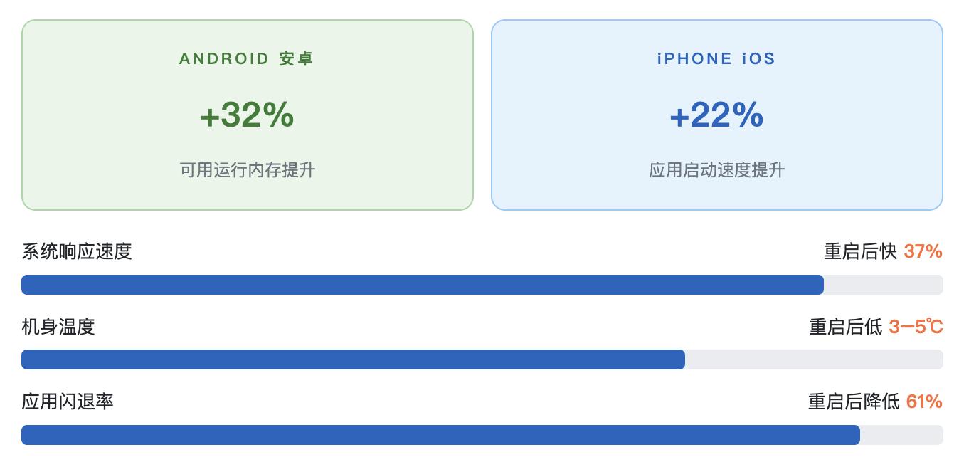 - 重启后:可用内存提升32%、响应速度快37%、机身温度降3–5℃