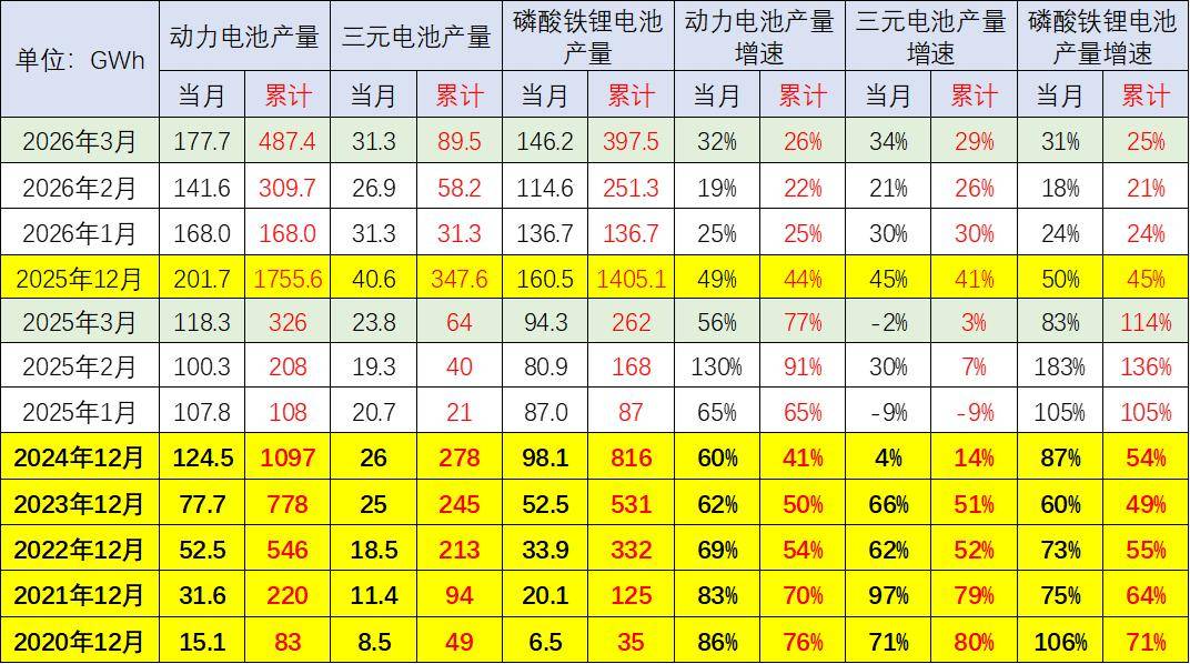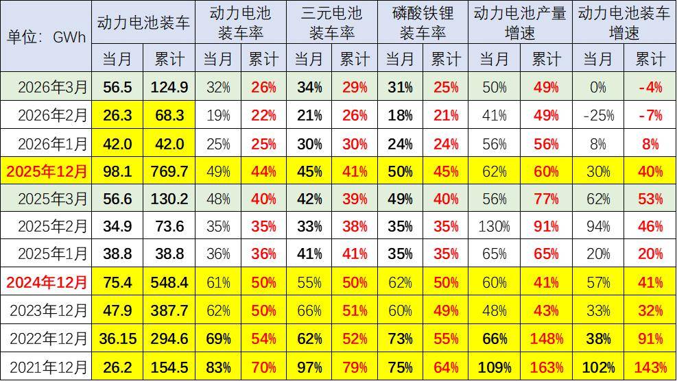 动力电池装车的需求增长是超强增速的。2019年需求增长10%;2020年内销车型动力电池装车64GWh,需求增长2%;2021年动力电池装车155GWh,需求增长143%;2022年装车295GWh,需求增长91%;2023年装车388GWh,需求增长32%;2024年锂电池装车548GWh,同比增长41%;2025年锂电池装车770Wh,同比增长40%。2026年3月锂电池装车56.5Wh,同比下降0.1%。