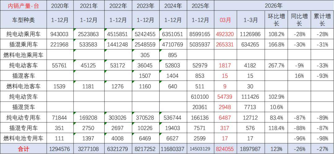 2026年3月新能源车国内市场的装车82万台、同比下降26%,其中纯电动乘用车49万台、同比下降28%;插混乘用车26.5万台、同比下降30%;纯电动货车5.5万台,这样的产量数据分化严重。