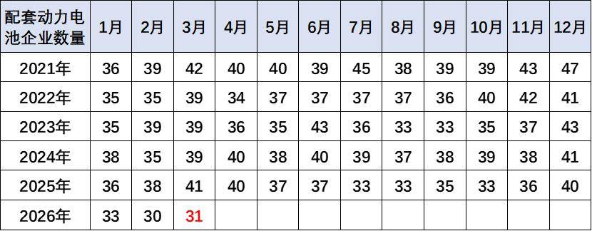 过去几年,电池市场的竞争格局并没有发生明显的变化,。2026年3月配套电池企业是达到31家的低位。由于动力电池市场的技术进步相对比较缓慢,而规模增长特征相对明显,加之储能等新产业需求发展,因此电池企业获得了较强的生产和装车数量增长的特征。