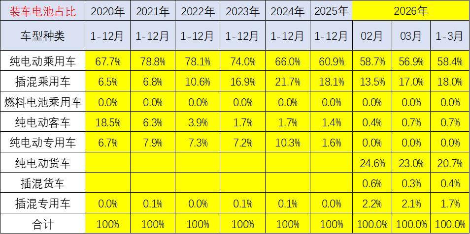从电池装车占比看,近几年动力电池的需求结构在快速变化之中。2020年还是乘用车纯电动第一,纯电动客车第二,纯电动专用车第三的格局,而插电混动乘用车只是第四位的状态。而到了2026年,纯电动乘用车仍然保持第一位,而插电混动乘用车上升到第三位,纯电动货车上升到第二位,插混专用车维持第四位的水平,纯电动客车下降到第五位。