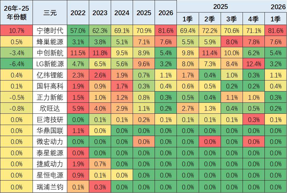 磷酸铁锂电池的产品差异优势明显。比亚迪仍然相对优秀,但今年年初处于调整期。宁德时代的磷酸铁锂电池的占比份额从2024年已经反超比亚迪。2026年比亚迪持续下行,份额较2025年下降4.2个百分点。亿纬锂能和国轩高科表现较强。欣旺达、瑞浦兰钧、中汽新能的提升明显。