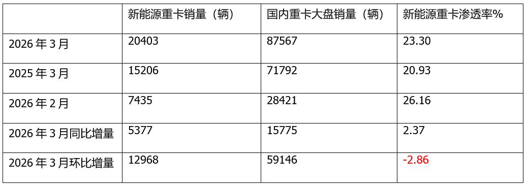 表2,根据终端上牌数据,2026年3月国内新能源重卡市场渗透率及同环比变化:
