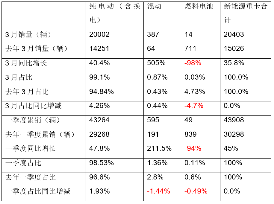 总之,在新能源重卡各动力车型中,无论是今年3月还是一季度,混动均领涨,燃料电池均领跌,纯电动主体地位均更强。