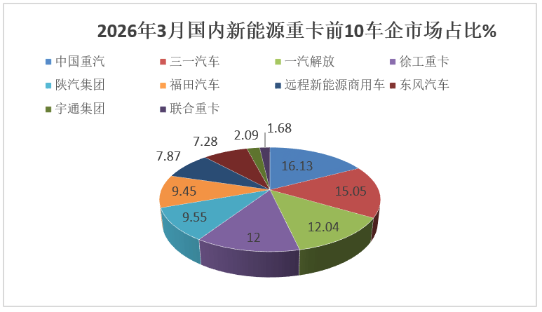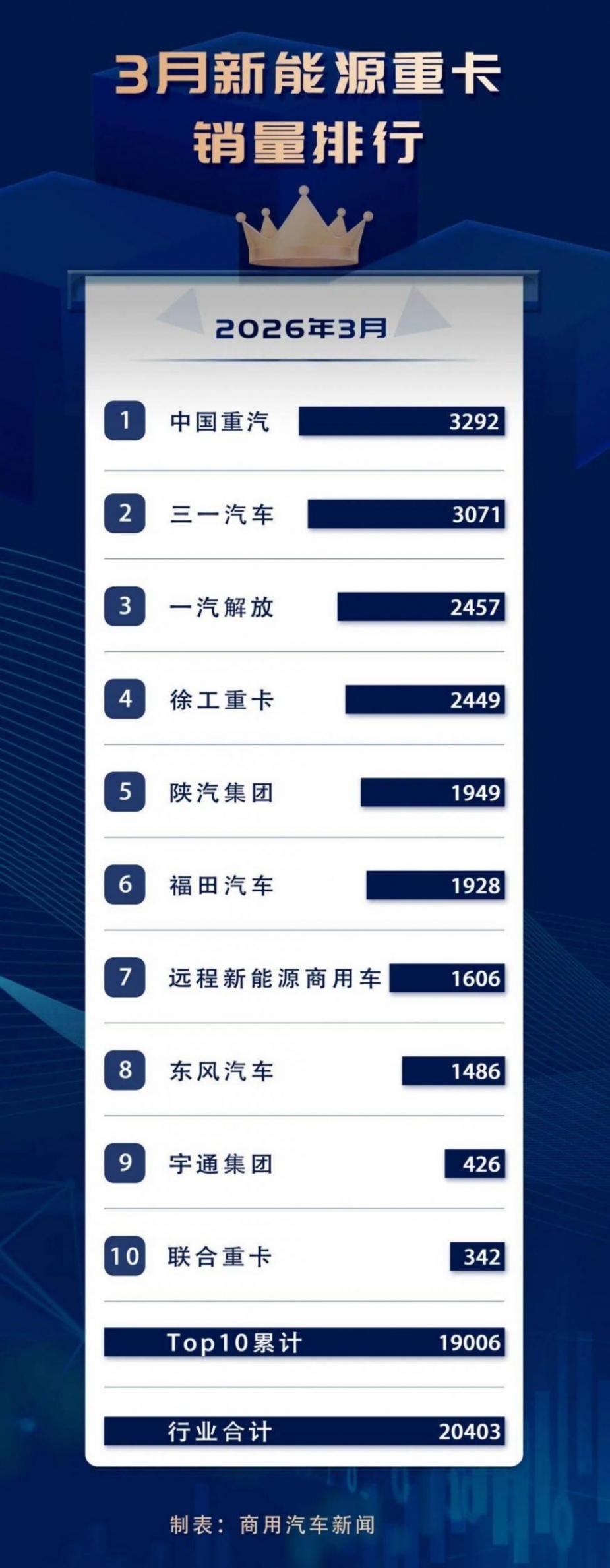 上图表显示,2026年3月新能源重卡销量Top10销量中以下特点较明显: