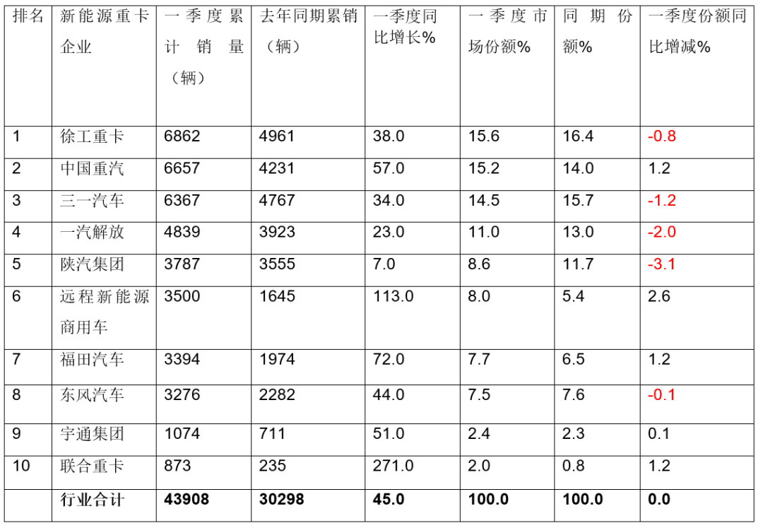 上表可见,2026年一季度新能源重卡Top10车企累销中以下几个企业特点比较突出: