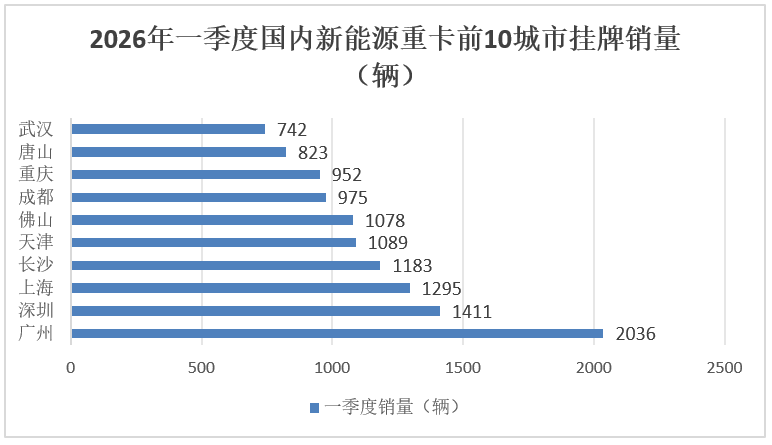 根据终端上牌数据,2026年一季度国内新能源重卡Top10城市累计销量统计: