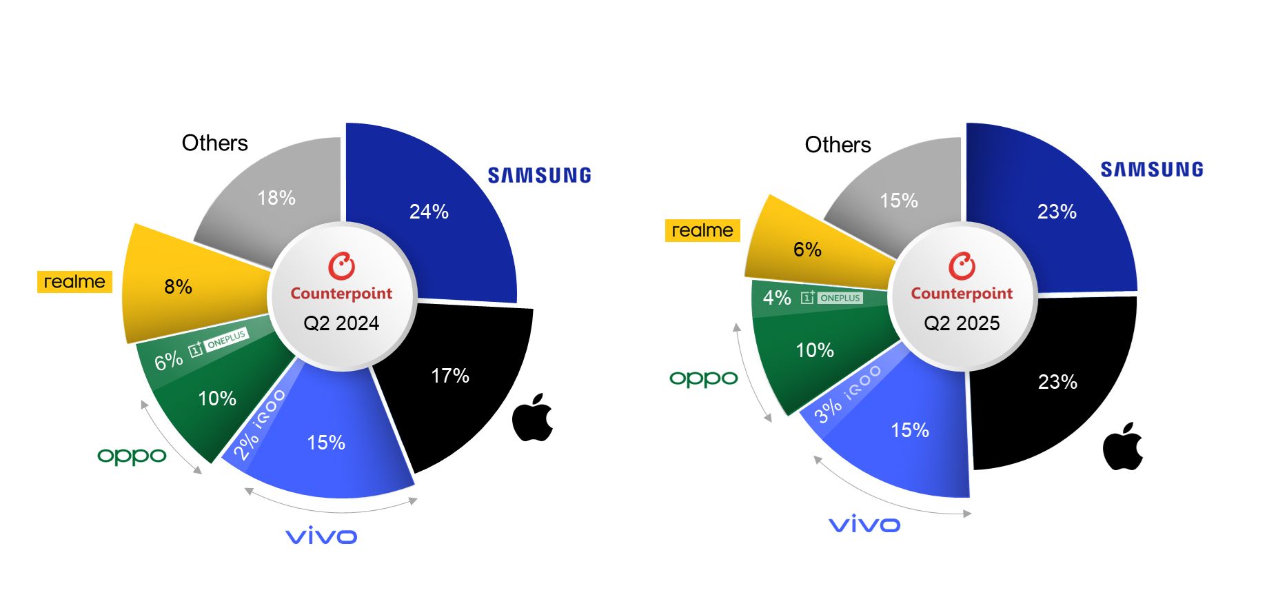 IT之家援引博文介绍,细分到品牌方面,vivo 公司占据市场主导地位,市场份额达到 20%,其中 iQOO 品牌从去年同期的 2% 增加到 4%;iPhone 16 成为 2025 年第二季度出货量最高的设备。在出货额方面,三星则以 23% 的市场份额领先。