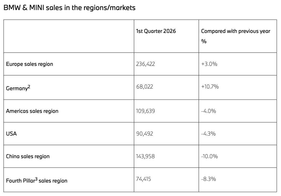 细分市场来看,中国仍然是跌幅最大的市场。2026年一季度宝马集团在欧洲市场销量同比增长3.0%至236,422辆,德国本土市场销量为68,022辆,同比增长10.7%。美洲市场出现下滑,季度销量同比下滑4.0%至109,639辆,美国市场销量下滑4.3%至90,492辆。