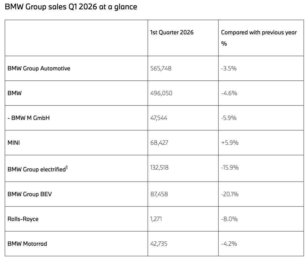 当地时间4月14日,宝马集团正式发布最新销量。报告显示,2026年一季度宝马集团全球销量为565,748辆,同比下滑3.5%,宝马电动车销量132,518辆,同比下滑15.9%,其中纯电动车销量87,458辆,同比下滑20.1%。