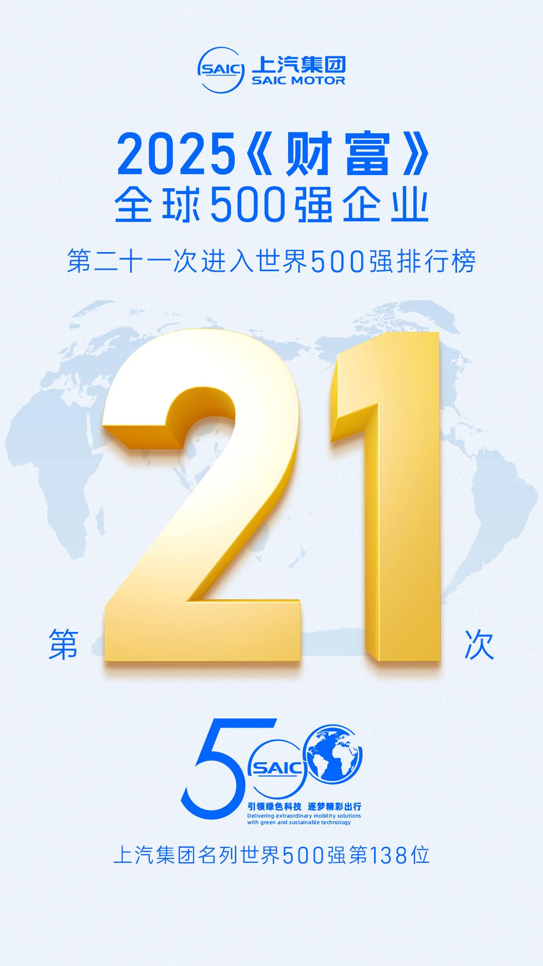 杂志于北京时间7月29日公布了2025年世界500强排行榜。上汽集团以2024年度合并报表872.239亿美元的营业收入名列世界500强第138位,第 21 次蝉联《财富》世界 500 强。这是其在全球化布局、技术创新、战略调整和体系能力建设等多维度协同发力的成果。