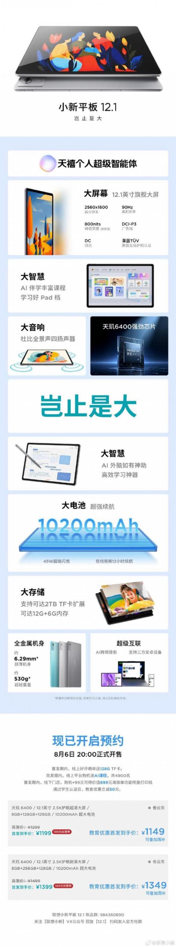 7 月 31 日消息,联想小新平板 12.1 参数价格今日公布,首发价 1199 元起,首发期可享教育优惠 50 元,到手 1149 元起,可叠加国补,8 月 6 日 20:00 正式开售。