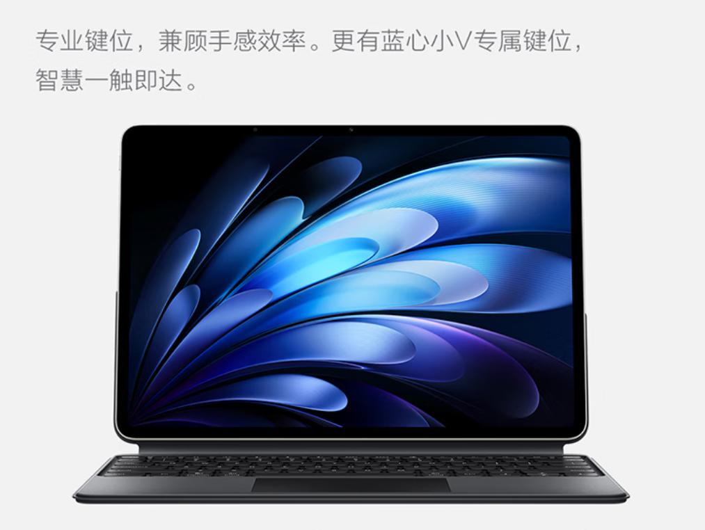 音频方面,配备八扬声器全景声学系统,支持杜比全景声。此外,还支持Wi-Fi 6、蓝牙5.4、USB 3.2 Gen1等数据连接功能,运行OriginOS 5 HD系统,集成PC级WPS、AI会议转写等生产力工具,配套磁吸键盘与vivo Pencil3手写笔提升办公效率。