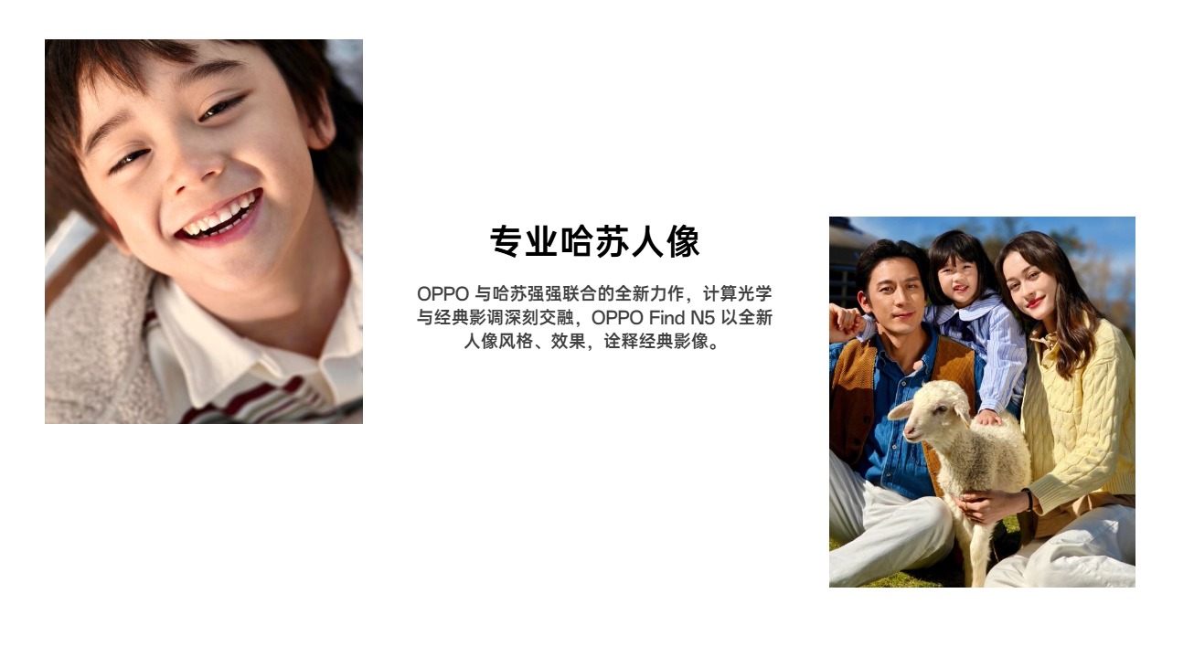 OPPO Find N5在影像系统方面尤其针对人像表现进行了大幅升级。与哈苏联合调校的全新人像系统,带来自然肤色、背景真实虚化和富有电影氛围的光影质感,支持多种经典胶片风格滤镜模拟,满足用户对高质感人像创作的审美要求。无论是城市逆光还是柔和室内光线,都能呈现出情绪丰富的人像作品,尤其适合喜欢氛围感和纪录式拍摄的用户。