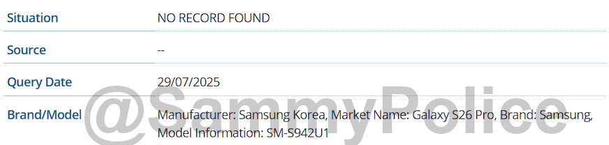 而根据 GSMA IMEI 数据库挖掘的信息,表明三星已启动更名计划,三星 Galaxy S26 和 Galaxy S26 Pro 共享“SM-S942U”手机型号,但 Pro 机型后缀添加了数字“1”。