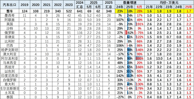 第三,出口均价的下调也反映结构性变化。2025年上半年,中国汽车出口均价为1.7万美元,低于2023年的1.9万美元。这一方面也反映出中国车企在新兴市场采取的仍是“低价渗透”策略。