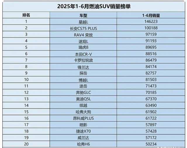 将目光聚焦到更具象的2025年上半年燃油SUV销量TOP20榜单,当前油车市场的竞争态势与品牌格局便跃然纸上。这份榜单传递出两个尤为鲜明的信号。