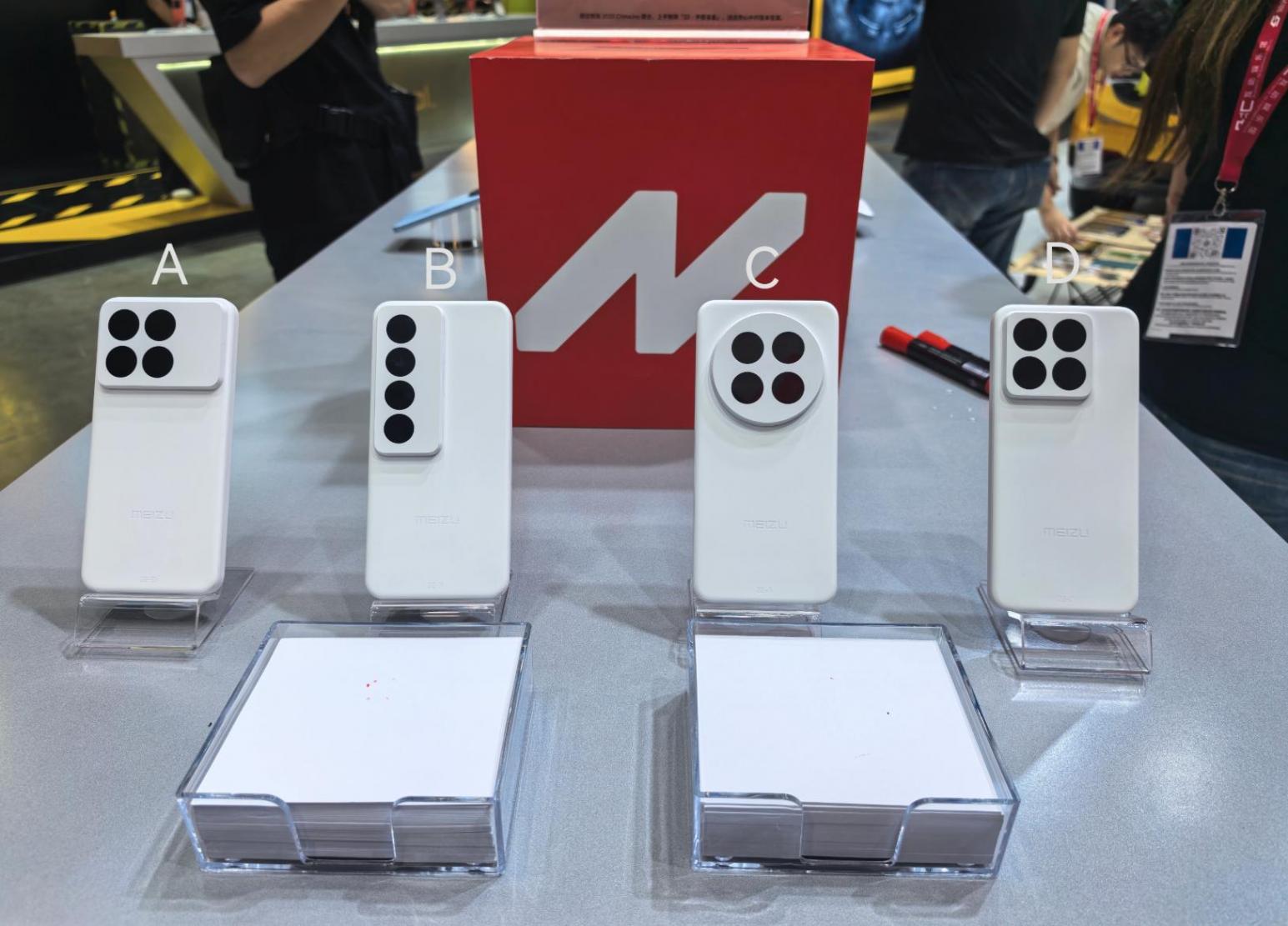 要说今天的热门看点,除了游戏本身,科技和汽车品牌的跨界玩法绝对抢尽了风头。比如说国产品牌魅族,在展示区集中呈现了魅族历年经典手机产品,从第一部国产智能手机魅族M8,到开创mBack指纹交互的魅族MX5,再到全球首款无孔设计手机魅族ZERO等等,还有就是悬念拉满的魅族22,魅族直接搞起了“手感盲盒”,直接摆出四款真假难辨的机模让玩家现场“盲猜”真身,大家也可以猜一猜,最有可能是魅族22的是哪一款?
