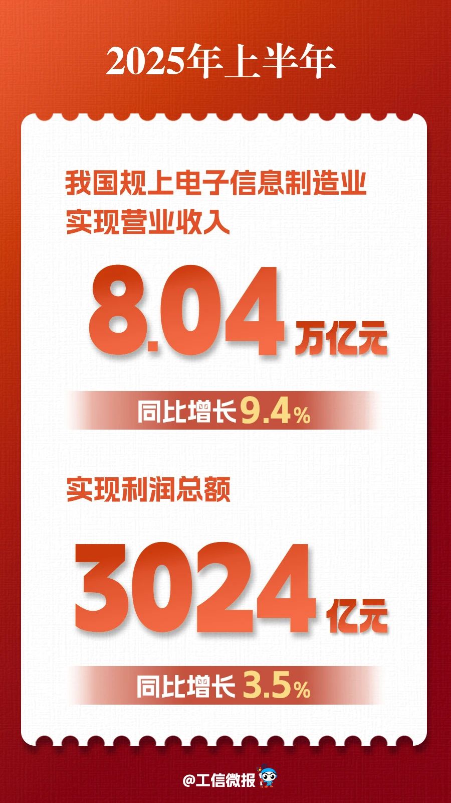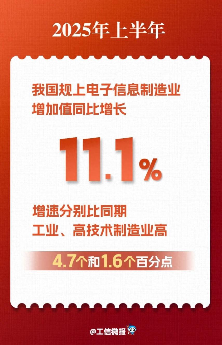 8月1日电 据“工信微报”微信公众号消息,8月1日,工业和信息化部发布2025年上半年电子信息制造业运行情况。