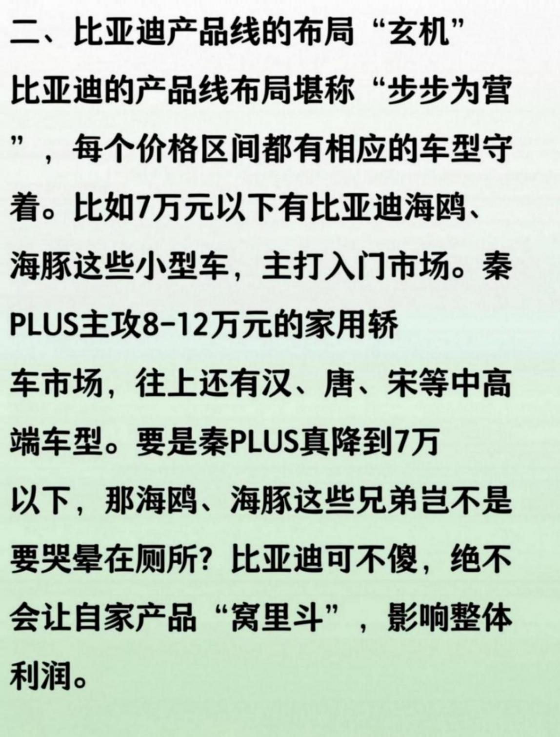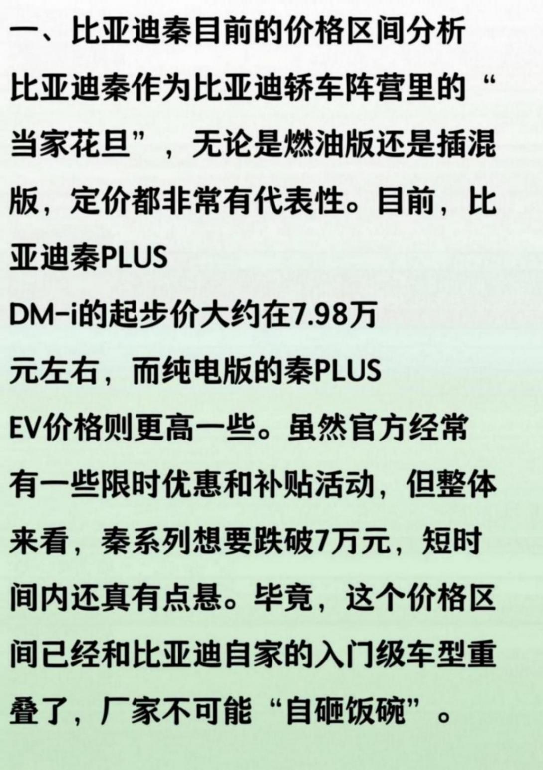 到比亚迪秦,大家都知道它一直是比亚迪家族里的销量担当,很多朋友买车时也会拿它和其他品牌比一比。最近有朋友问,秦会不会降到7万以下?其实只要看看比亚迪现在的产品布局和定价策略,答案其实挺明显的。