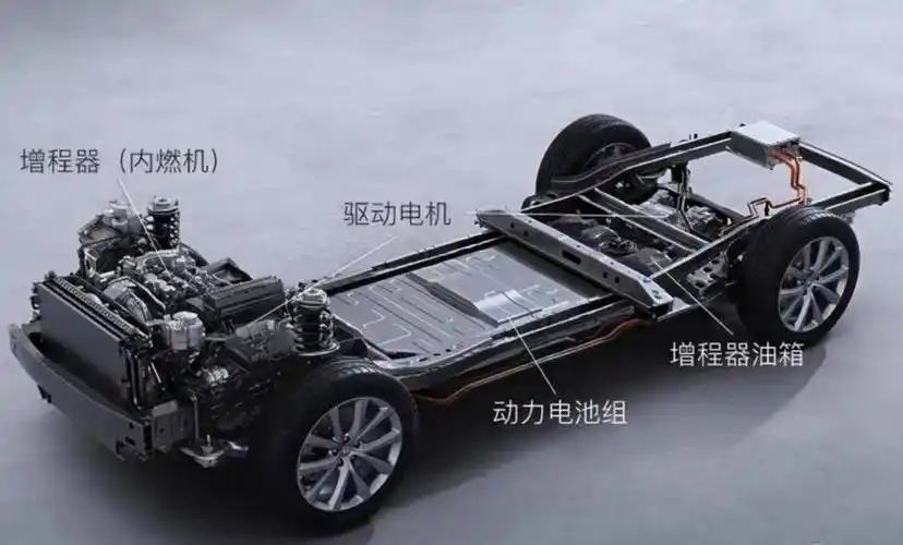 核心结构: 电池 + 电机 + 电控 + 增程器 (小发动机+发电机)