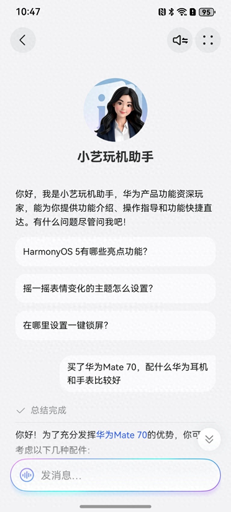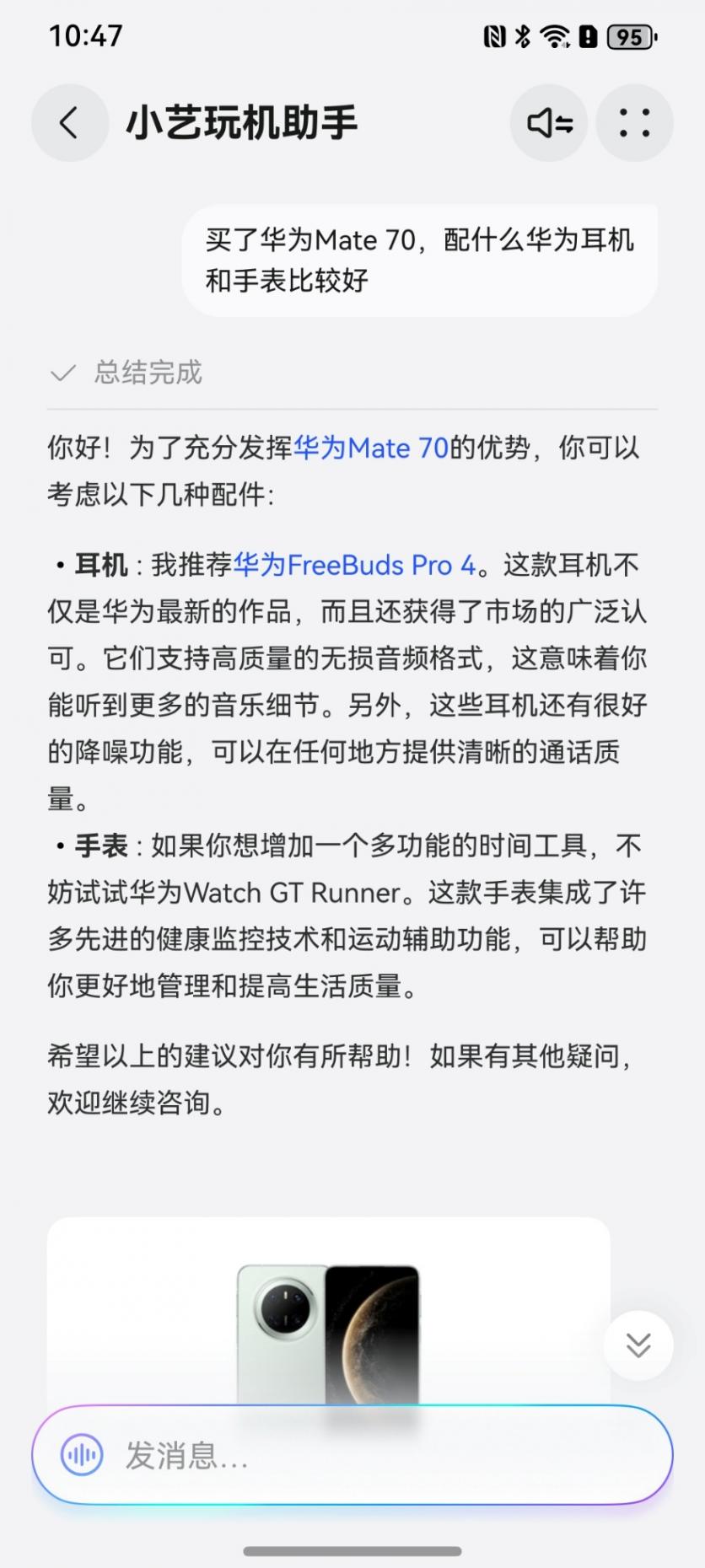 直接问“买了华为Mate 70,配什么华为耳机和手表比较好”?等待了一会,答案清晰地呈现在眼前。在耳机方面,它推荐华为FreeBuds Pro 4,搭配华为Mate 70,可以享受高质量无损音频,享受更多的音乐细节。而手表方面,它建议华为Watch GT Runner,能更好地管理和提高生活质量。