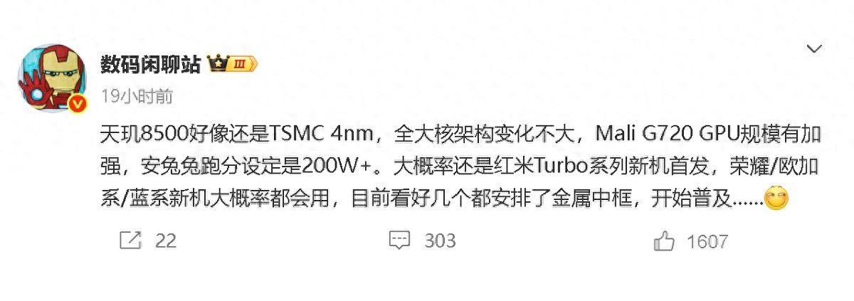 近日数码闲聊站爆料,天玑8500“好像还是TSMC 4nm,全大核架构变化不大。”