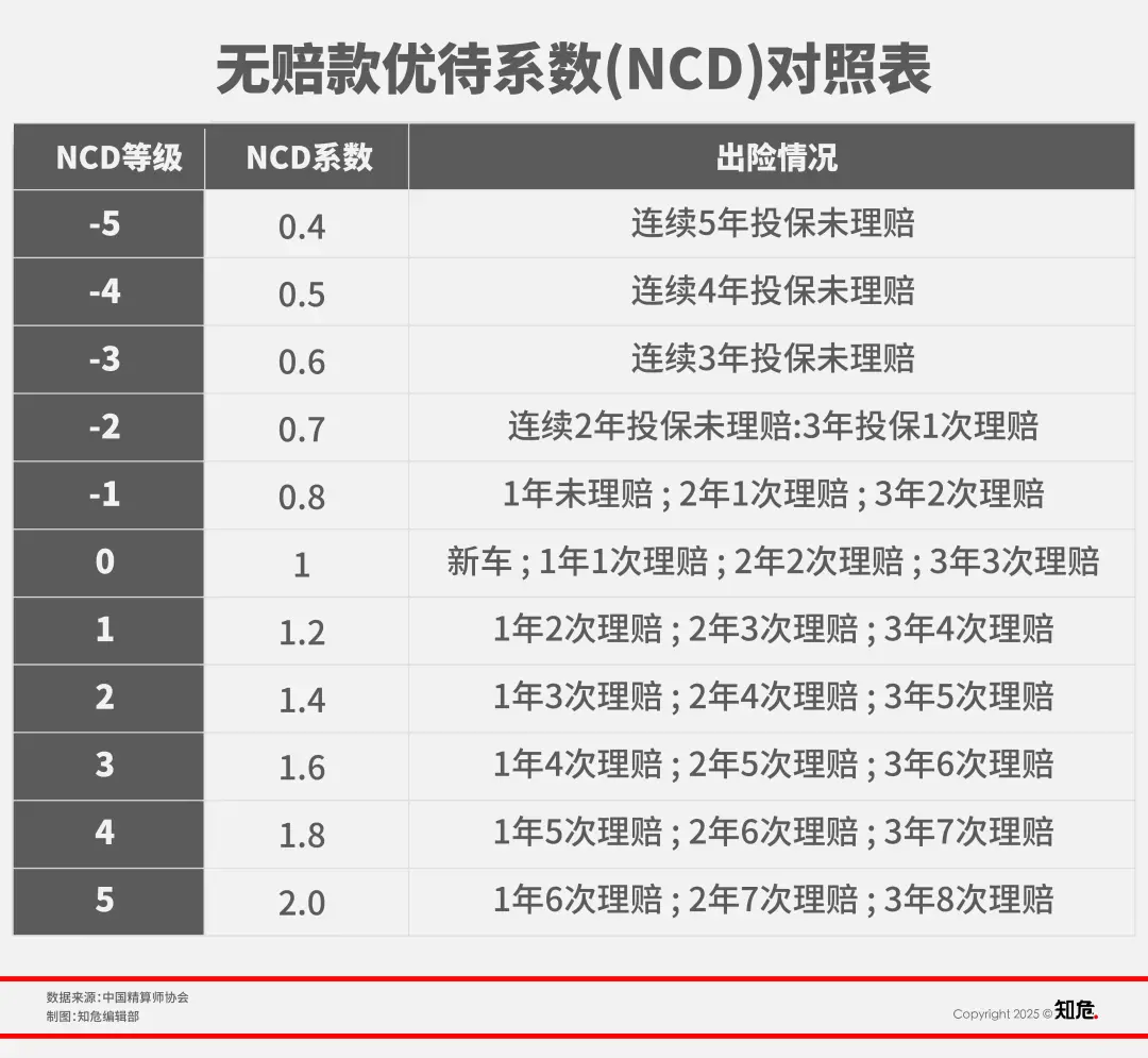 在这个公式中,无赔款优待系数( NCD 系数,no-claim discount )是商业险中为数不多与车主驾驶行为直接挂钩的变量。该系数基于车辆历史出险记录动态调整保费的奖惩机制,不同保险公司执行统一标准,旨在通过 “ 奖优罚劣 ” 实行风险与成本匹配。