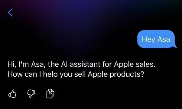 9 月 1 日消息,根据 MacRumors 分析师 Aaron Perris 今日提供的截图,苹果向旗下零售员工推出了一款新的 AI 聊天机器人 —— Asa。