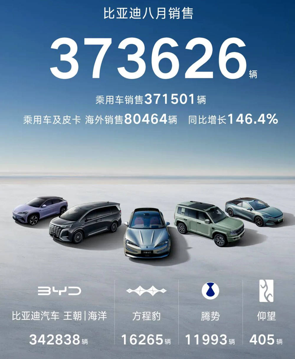 在刚刚过去的8月份,比亚迪单月销量达到了373626台,其中,海外出口80464台,同比增长高达146.4%。2025年1-8月累计销量2863876台,其中,海外市场累计销量超过63万台。单月销量保持在30万台以上,对比亚迪来说基本上也就是常态化,用一些车友和网友的话说,就是可以被围堵但很难被超越。