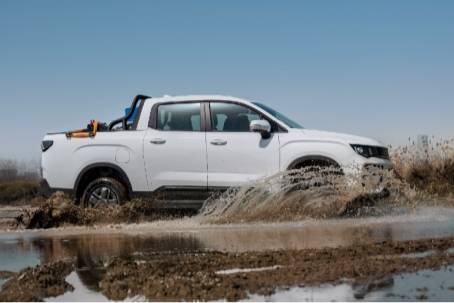 在安全方面,车身采用70%高强度钢,整车扭转刚度高达30300N·m/deg,远超传统燃油皮卡的5000–8000N·m/deg,抗冲击能力显著提升。三电系统秉承吉利银河星舰同源安全标准,电池包通过472项严苛测试,具备6大安全技术与IP68防尘防水等级。首任车主可享三电系统终身质保。底盘最小离地间隙为225mm,电池护甲厚度达10mm,为乘用车的5倍,即便重载亦有效防托底。
