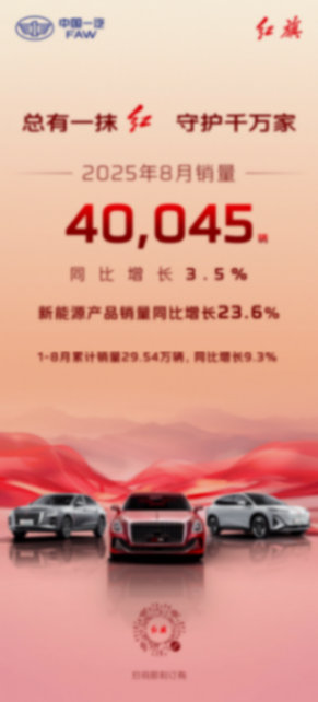 此前,在9月1日,中国第一汽车集团有限公司(简称中国一汽),公布了最新8月的产销报告,中国一汽8月整车销量突破27.78万辆,同比增长3.7%。1-8月累计销量突破208.13万辆,同比增长5.5%。