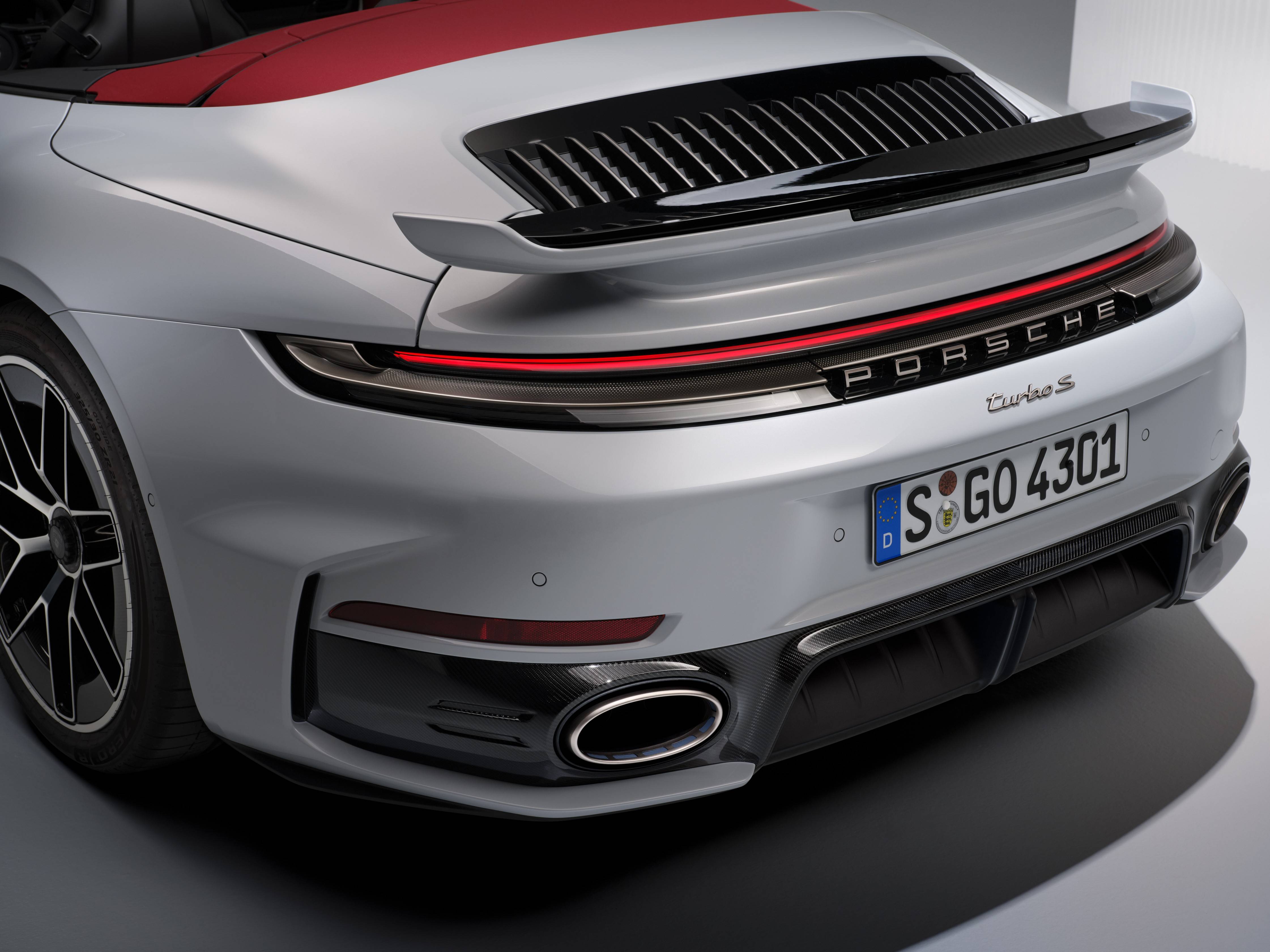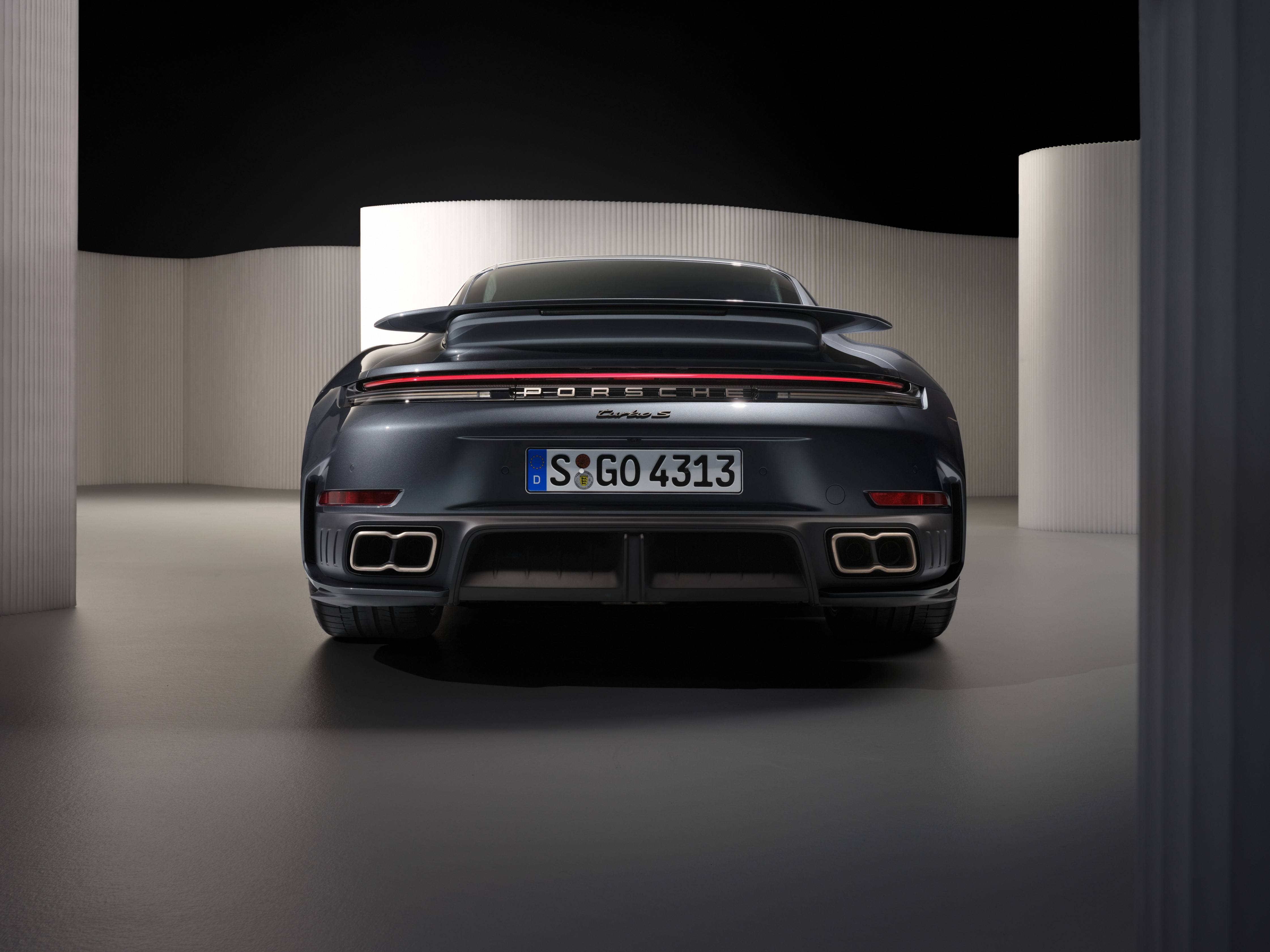 轮胎方面,新款保时捷911 Turbo S前轮采用255/35 ZR 20轮胎,后轮采用325/30 ZR 21轮胎,同时新车标配保时捷陶瓷复合制动系统 (PCCB) 采用源自赛车运动的新型刹车片。此外,新车还配备后部侧面通风口。车尾部分,新车依旧采用贯穿式尾灯组,细长的造型配合车尾“Turbo S”字样,极具辨识度。