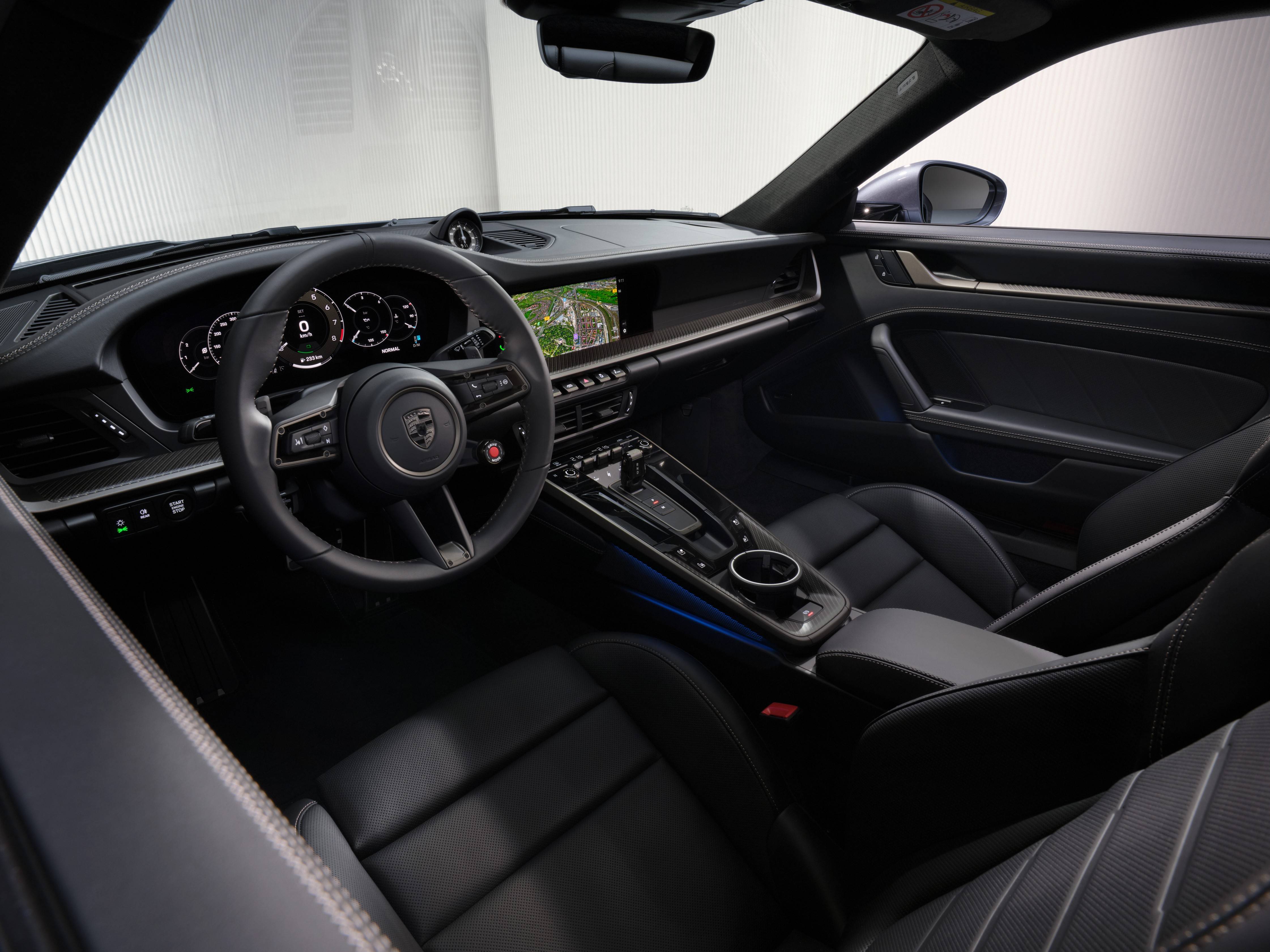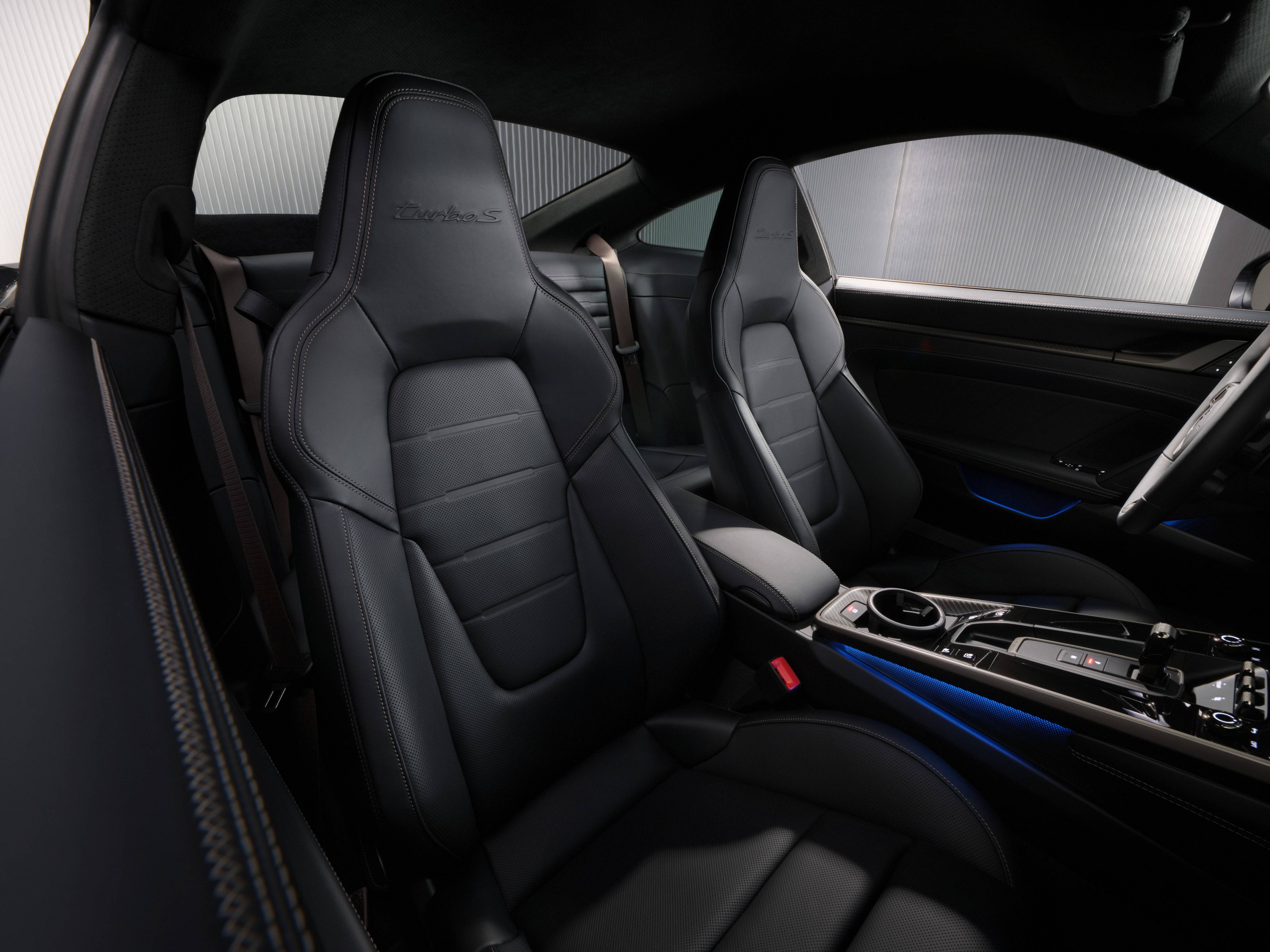 内饰方面,新款保时捷911 Turbo S配备12.6英寸全液晶数字仪表盘,以及10.9英寸中控多媒体触控屏幕,屏幕下方依旧是物理按键以及“麻将牌”式的换挡机构。新车还配备了一体式座椅,并首次采用的金属钕色饰件碳纤维结构饰条,以及黑色背衬打孔超细纤维车顶内衬。