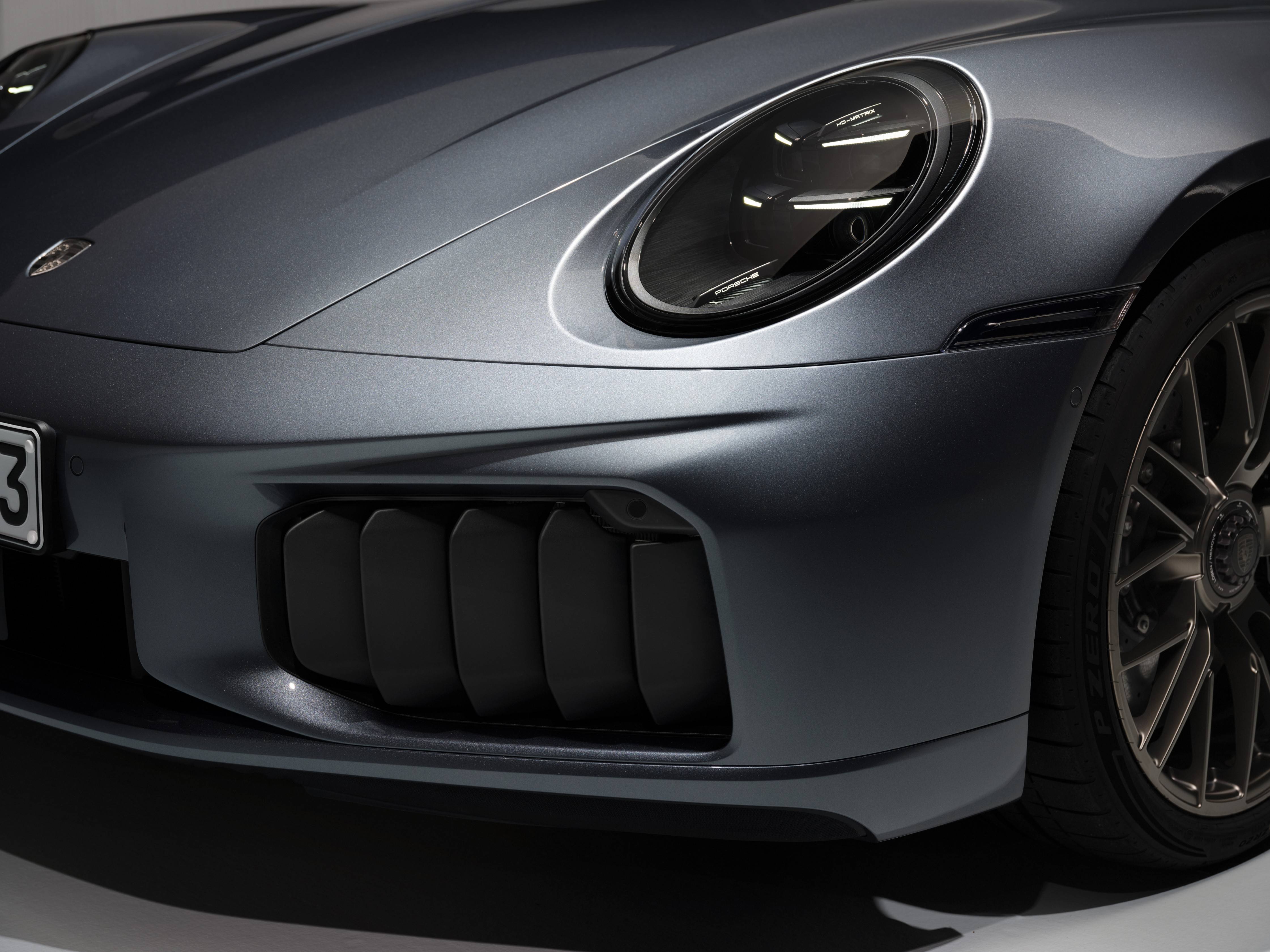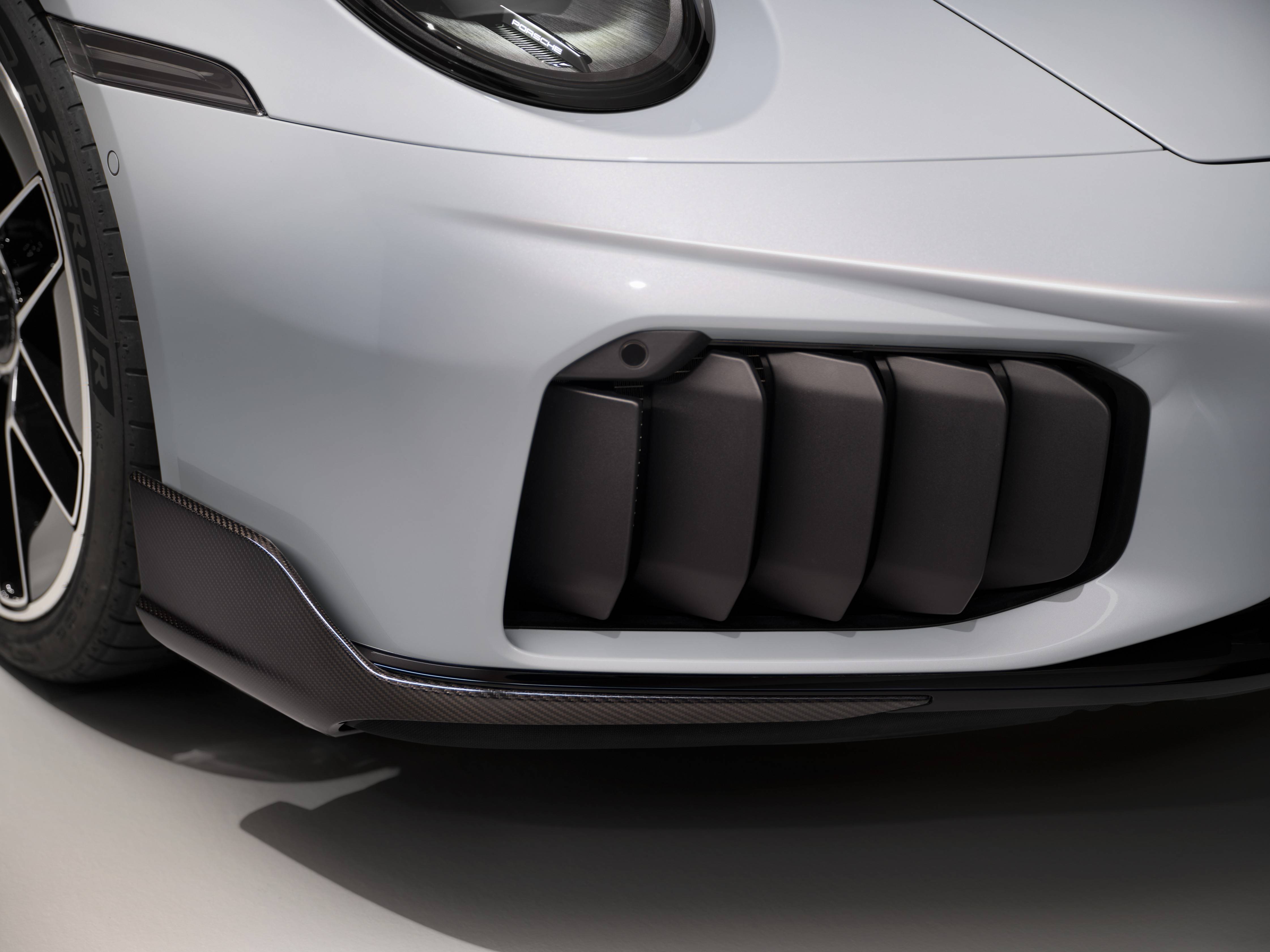 值得一提的是,新款保时捷911 Turbo S优化了冷却效率与整体性能。车前部垂直布局的主动式冷却空气导流板、主动前扩散器,与源自前代的可变前唇扰流板、可伸缩的尾翼共同构成高效协同系统。冷却气流可精准导向制动系统与驱动冷却器。新车主动空气动力学系统可智能降低升力或风阻,硬顶版风阻系数较前代降低10%。此外,该系更提升了顶级车型的湿滑路面制动表现:湿地模式下,前部冷却空气导流板将关闭,防止前制动盘受过多溅水影响。