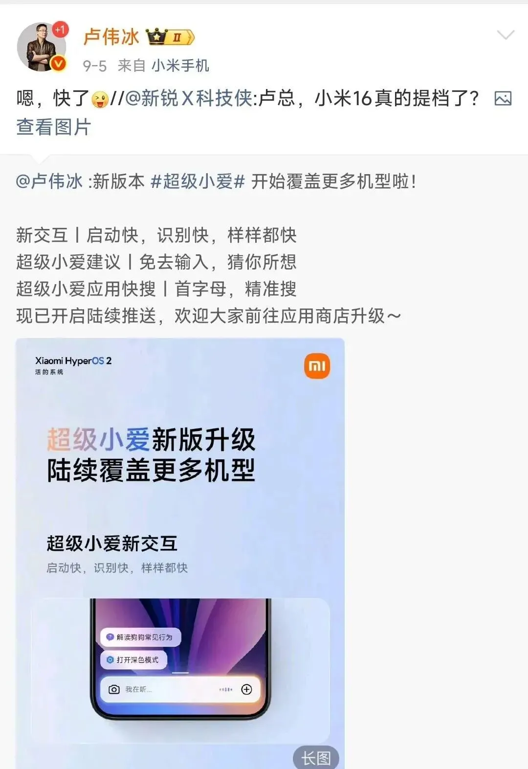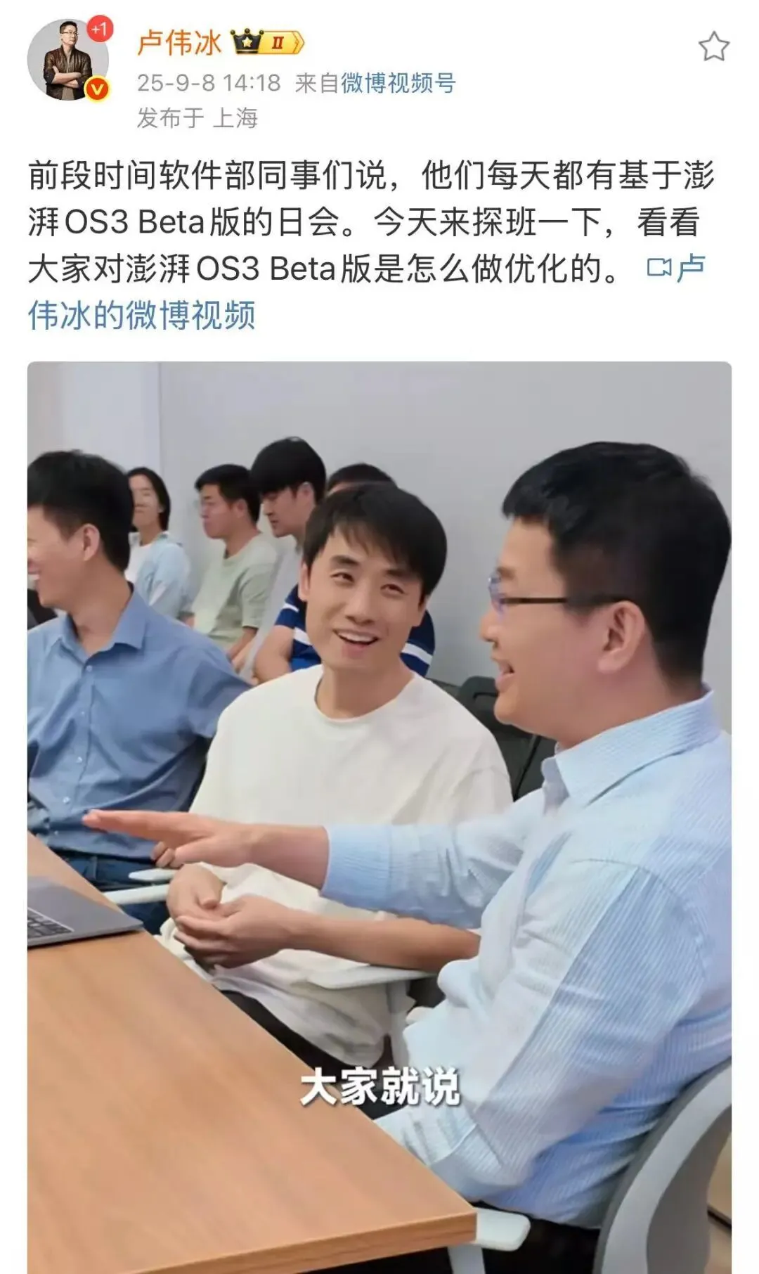 也可以看到卢伟冰已经在为新机做预热了,除了上面提到的发布会提档,卢伟冰还探班了澎湃OS3技术团队,预计该系统正式版将在小米16上首发。