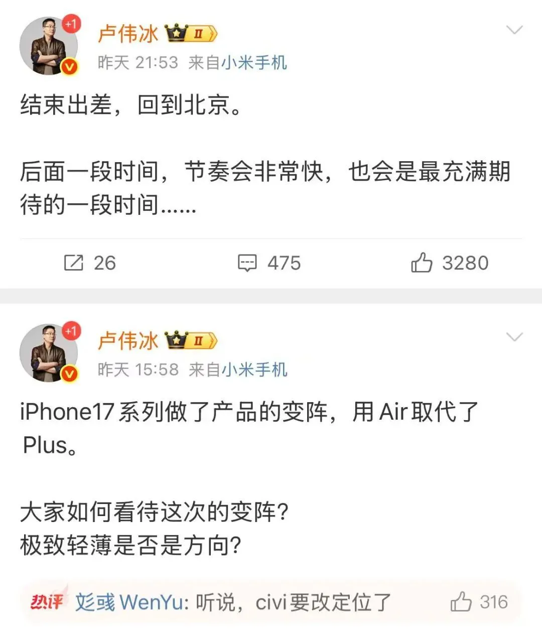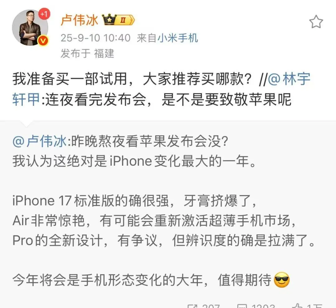 此外,卢伟冰最近发布了多条有关苹果iPhone17的微博。最近基本都是在谈手机相关的话题。