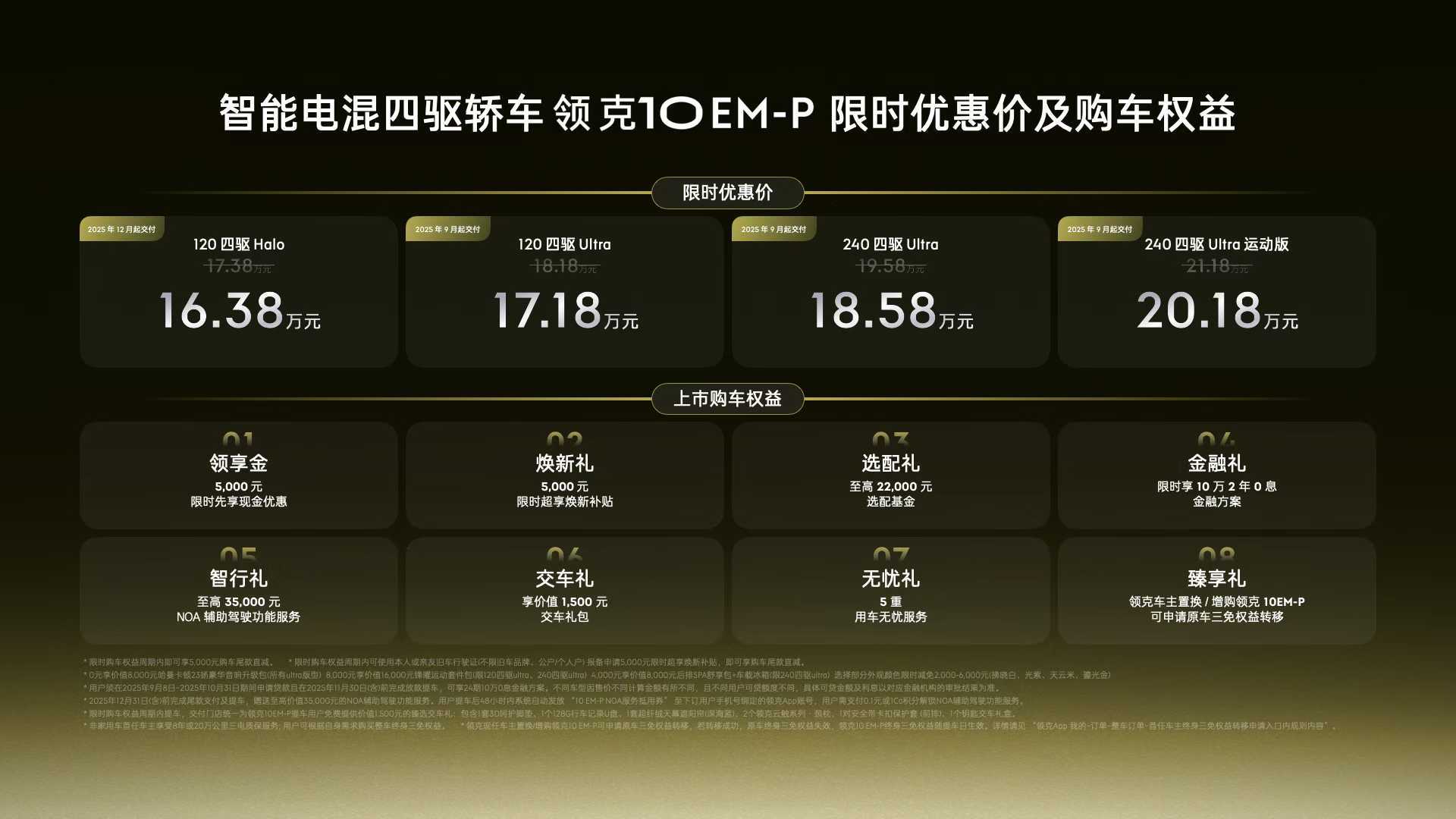 实事求是地讲,领克10 EM-P的正式价格确实很有吸引力,尤其是入门款,作为一个四驱车型,比迈腾、帕萨特等都更便宜,还不用给购置税。但问题还是如我们之前所述,领克10 EM-P全系四驱完全没有必要,用户更需要的是大电池两驱版车型,目前240公里长续航四驱价格还是超过了18万元,性价比没有那么高。