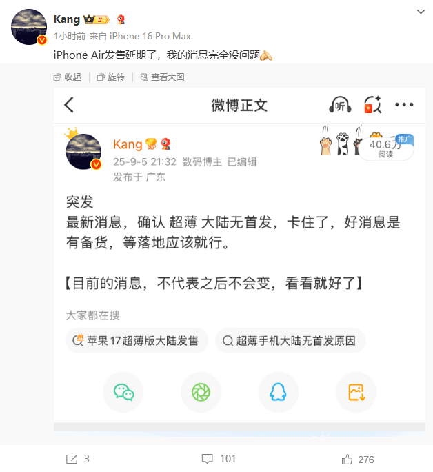其实这事儿也早有预兆。记得 9 月 5 号的时候,数码圈知名博主 @kang 就发过一条微博,说“超薄大陆无首发,卡住了,好消息是有备货,等落地应该就行”。