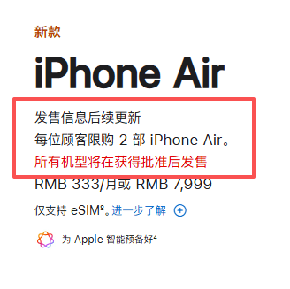 9 月 12 日消息,自从前两天苹果新品发布会结束后宣布在今天开始预购,苹果对 Apple Store 官网进行了更新,发现苹果将 iPhone Air 的发售时间改成了“发售信息后续更新”,下面还加了行小字“所有机型将在获得批准后发售”。